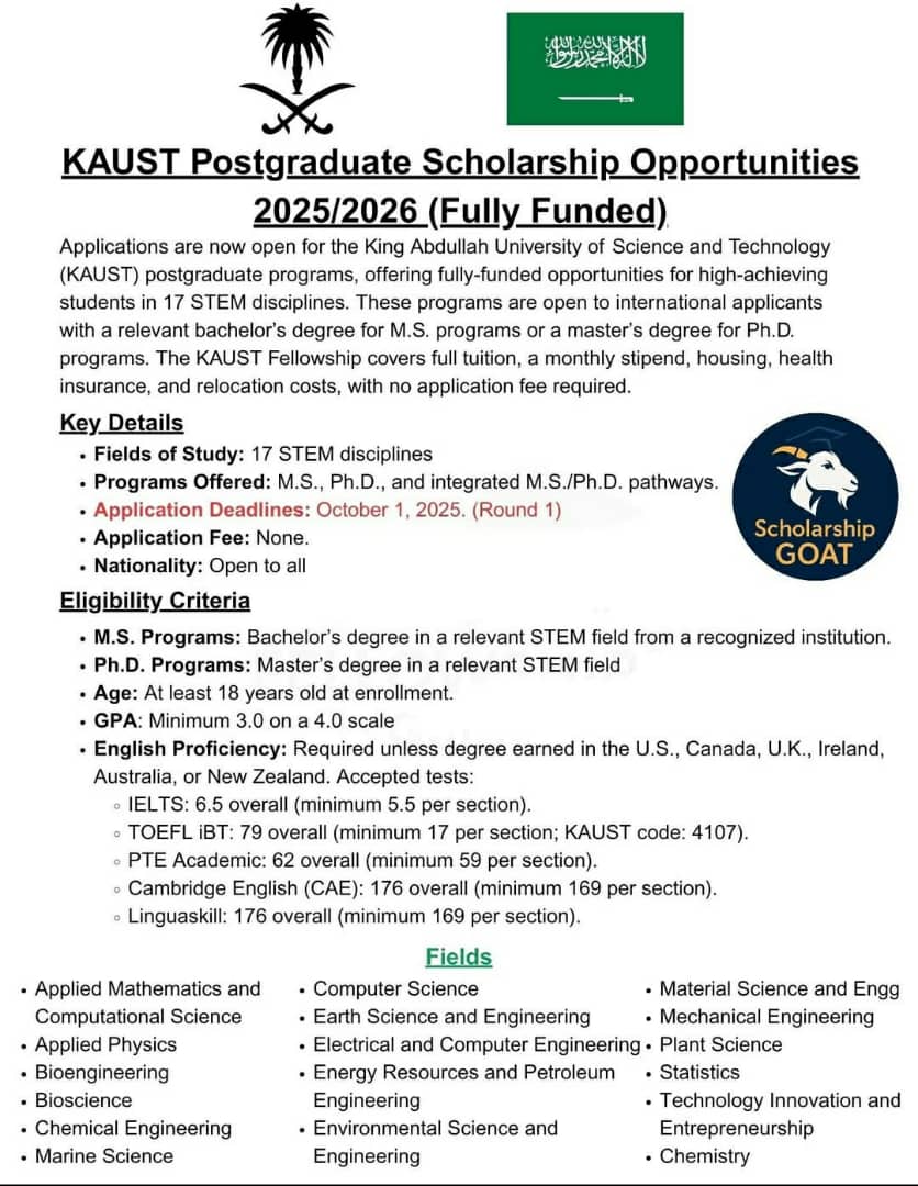 #scholarshipgoat #KAUST #PostgraduateScholarship #STEMScholarship #FullyFundedScholarship #InternationalStudents #MSPrograms #PhDPrograms #SaudiArabiaScholarship #ResearchOpportunities #AcademicExcellence #NoApplicationFee #StudyAbroad #HigherEducationInnovation