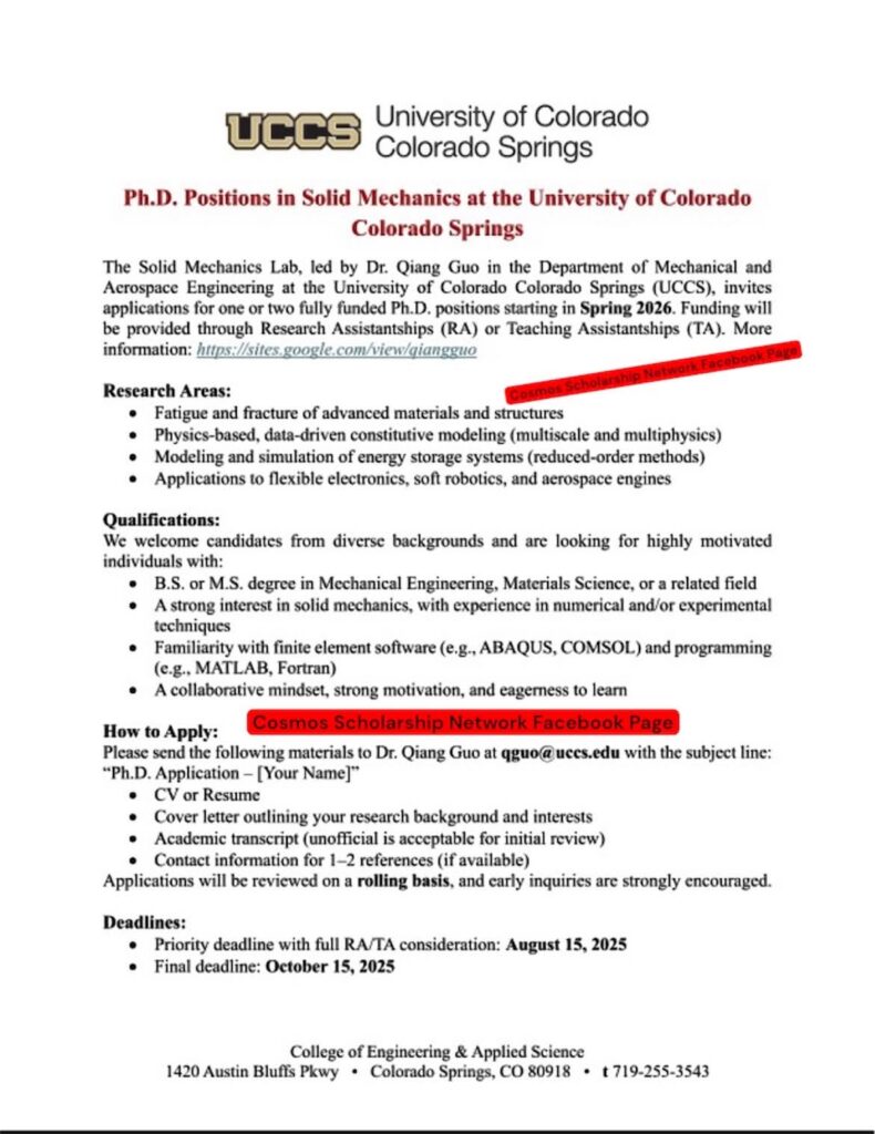 The Solid Mechanics Lab in the Department of Mechanical and Aerospace Engineering at the University of Colorado Colorado Springs is recruiting 1–2 fully funded Ph.D. students.