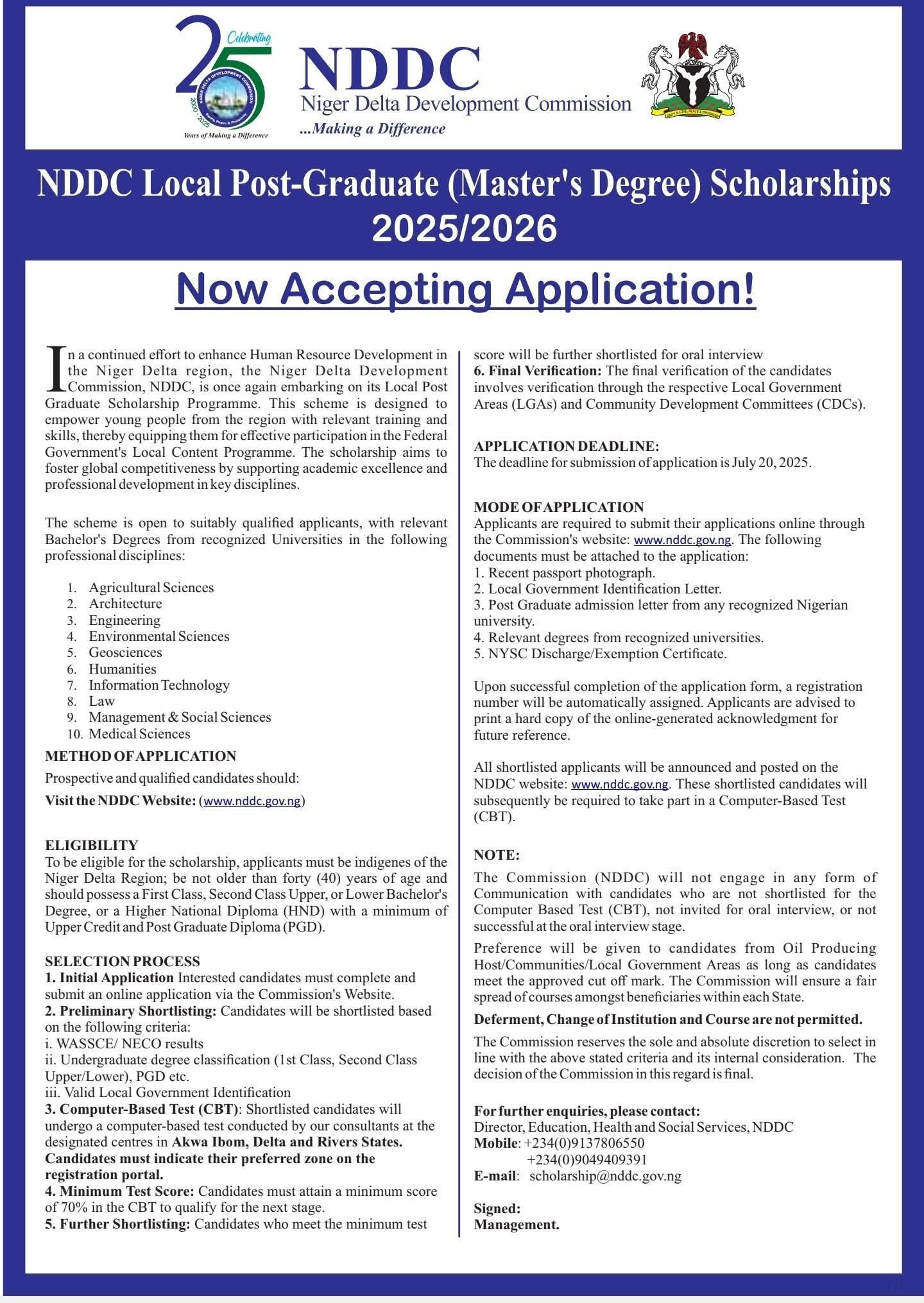 The Niger Delta Development Commission (NDDC) invites applications from qualified indigenes of the Niger Delta region for its Local Master’s Postgraduate Scholarship Programme for the 2025/2026 academic session.