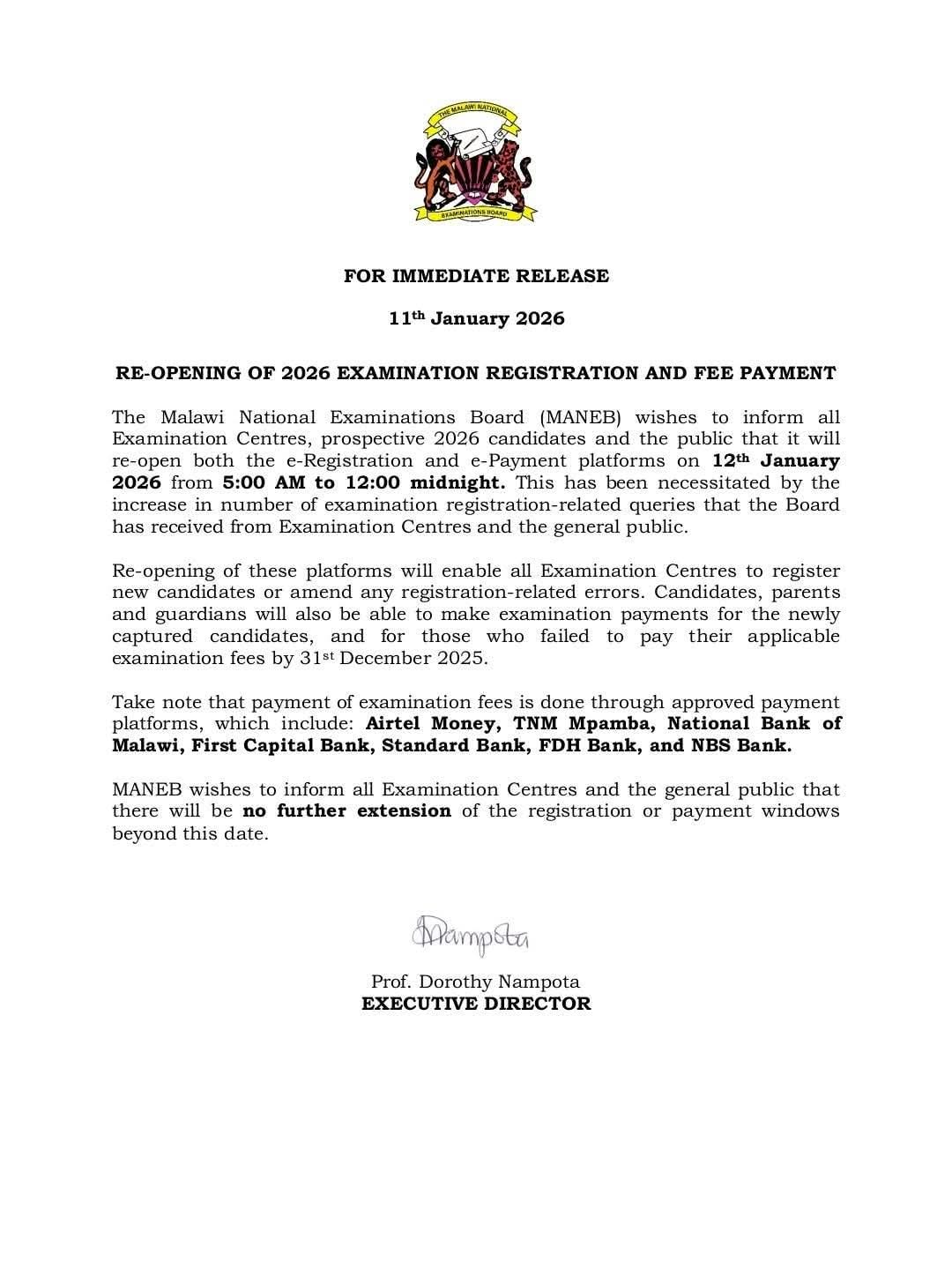 According to MANEB, the reopening will enable examination centres to register new candidates and correct errors in existing registrations. It will also give candidates, parents and guardians the opportunity to pay examination fees for newly registered candidates, as well as for those who failed to complete payment before the December 31, 2025 deadline.