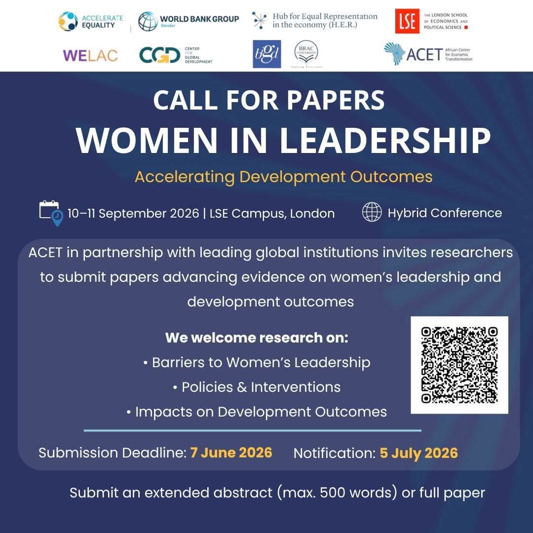 ACET in partnership with leading global institutions, invites submissions for the Women in Leadership: Accelerating Development Outcomes conference.