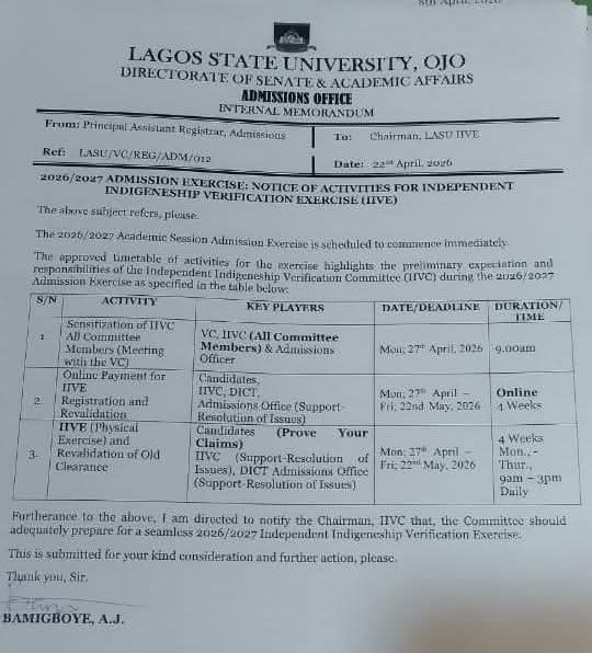 Lagos State University (LASU) has officially announced the commencement of the 2026/2027 admission exercise for Independent Indigenes through the Indigeneship Verification Exercise (IIVE).