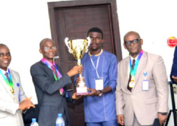 Read moreDetailsSharing the joy of victory: Prof. Ademola Tayo receives the trophy from BU team Captain, Emmanuel Aghahowa. With them are:...