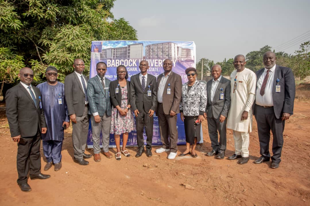 Prof Ademola Tayo with Babcock University Officers. Left is the University Registrar, Prof. Jonathan Nwosu. Others are (left-right): Prof. Abraham Idowu, ITDS Associate Vice President, BUTH CMD, Prof Banarbas Mandong and Director of Clinical Services Prof. Titus Oyedele, Prof Grace Tayo, Director of Research, Innovation and International Cooperation and other officers.
