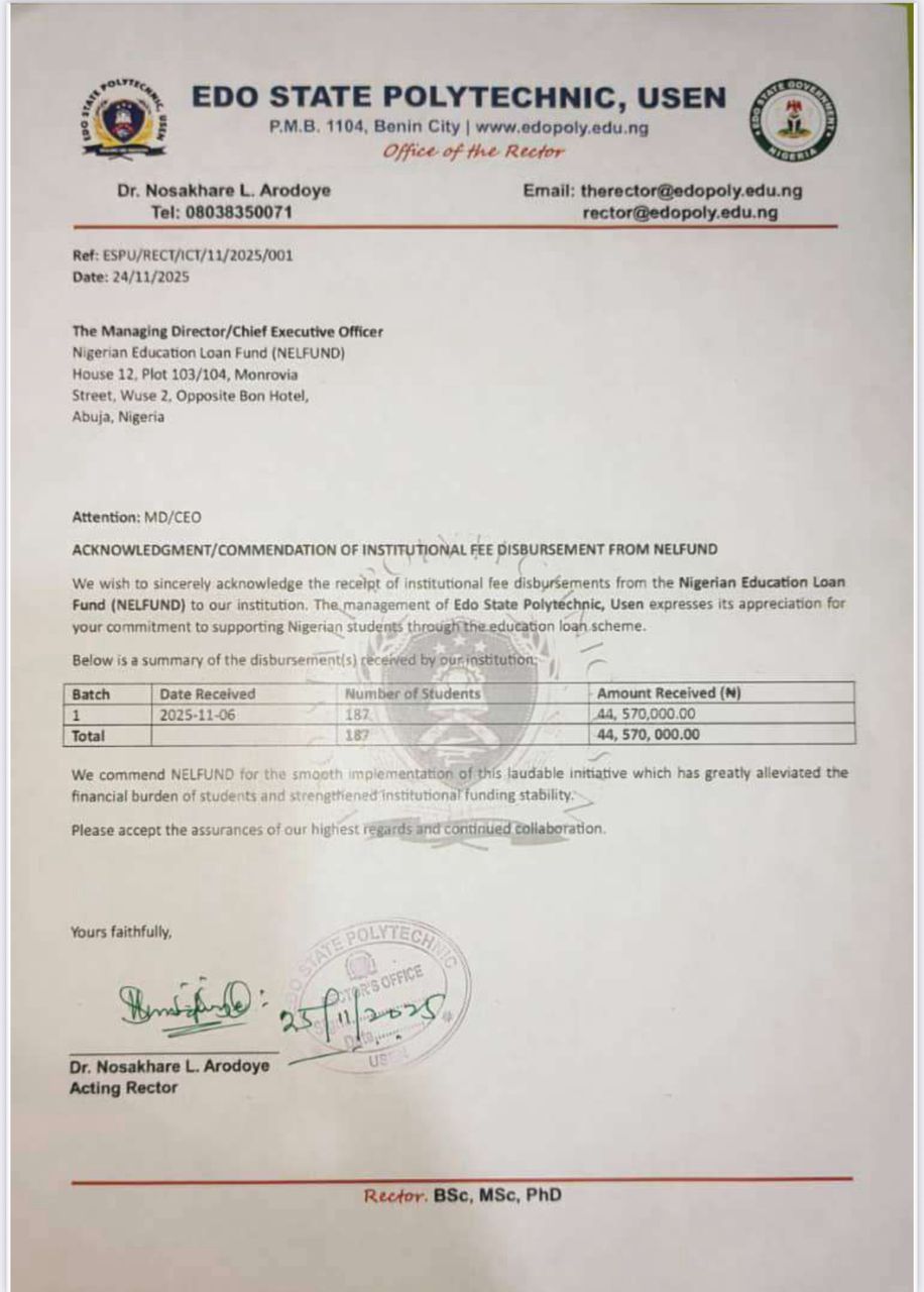 Edo State Polytechnic, Usen, has formally acknowledged the receipt of institutional fee disbursements from the Nigerian Education Loan Fund (NELFUND), describing the intervention as a major boost to student welfare and institutional stability. The acknowledgement was contained in a letter dated November 24, 2025, and signed by the Acting Rector, Dr. Nosakhare L. Arodoye.