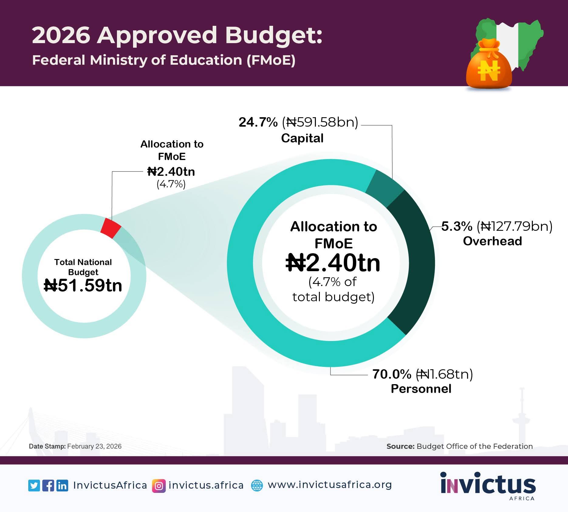Data released by Invictus Africa, citing figures from the Budget Office of the Federation, shows that of the ₦51.59 trillion 2026 national budget, ₦2.40 trillion was allocated to the FMoE — representing just 4.7 per cent of total public spending.