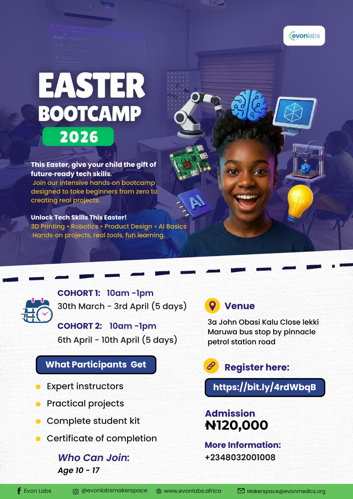 Spaces are limited, and these programs fill up fast. Give your child the chance to invent, create, and innovate this Easter! Sign up here – https://evonlabs.africa/easter-bootcamp