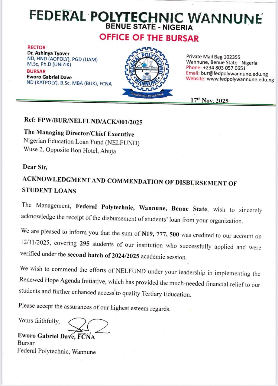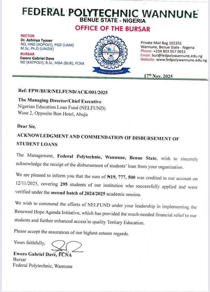 Federal Polytechnic Wannune, Benue State, has officially acknowledged the receipt of ₦19,777,500 disbursed by the Nigerian Education Loan Fund (NELFUND) to support its students under the second batch of the 2024/2025 academic session.