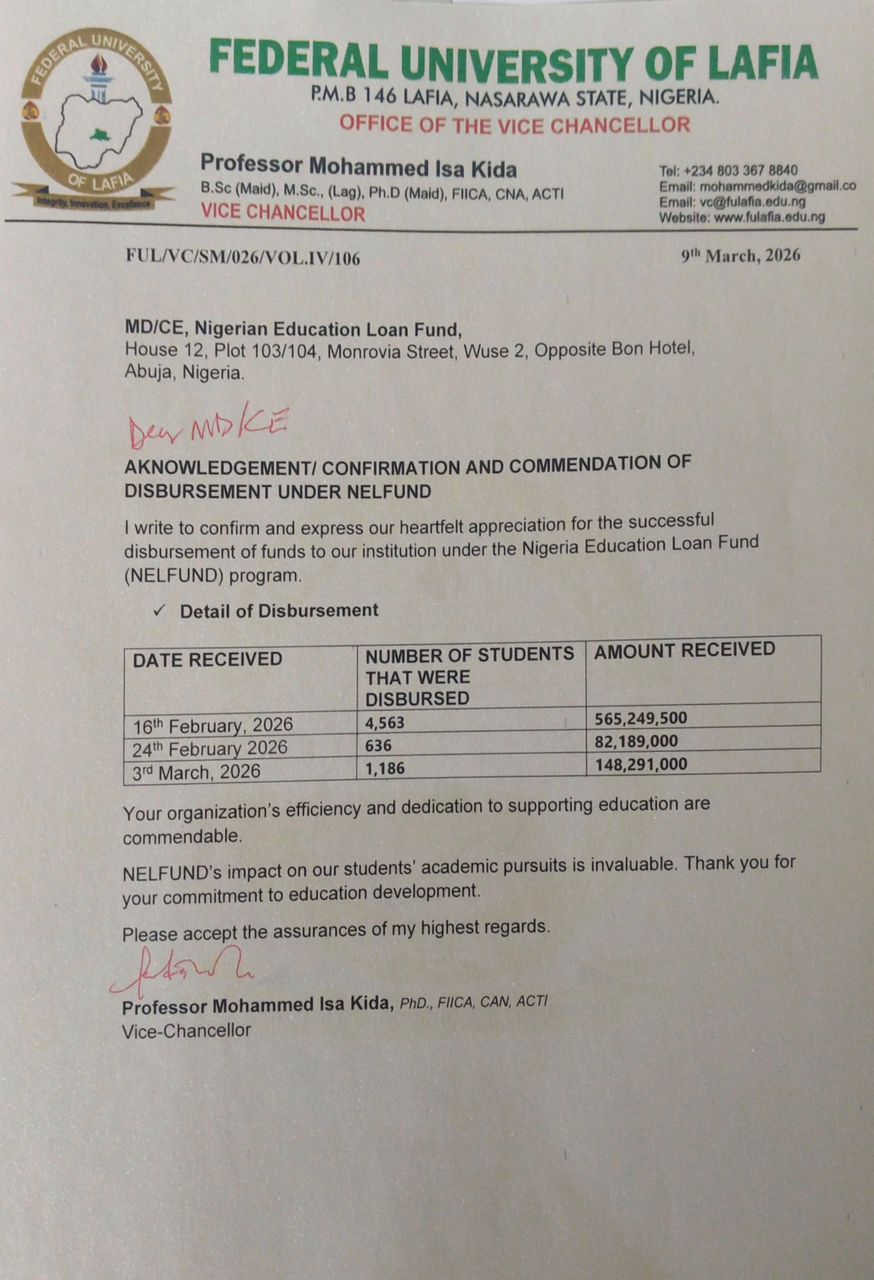 On behalf of 6385 students studying at The *Federal University, Lafia, Nasarawa State, NELFUND has paid a substantial amount to the institution, for the 2025/2026 academic session: