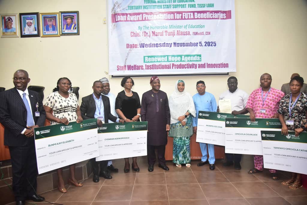 The implementation of the Tertiary Institution Staff Support Fund (TISSF), a support loan scheme of the Federal Government of Nigeria to staff of tertiary institutions, has been flagged off by Minister of Education, Dr Tunji Alausa, CON, with the formal presentation of cheques to selected beneficiaries who applied for the scheme at the Federal University of Technology, Akure, FUTA. The event held at the Council Chamber of the institution on Wednesday, November 5, 2025.