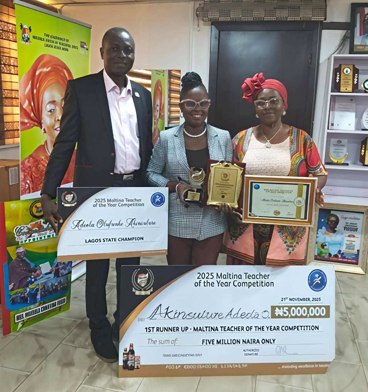 Mrs. Adeola Akinsulure, the First Runner-Up of the 2025 Maltina Teacher of the Year Award, alongside the Principal of Omole Senior Grammar School, Mrs. Lloyda Akintunde, recently paid a courtesy visit to the Tutor-General/Permanent Secretary (TG/PS), Education District VI, Mrs. Mojisola Christiana Yusuff.
