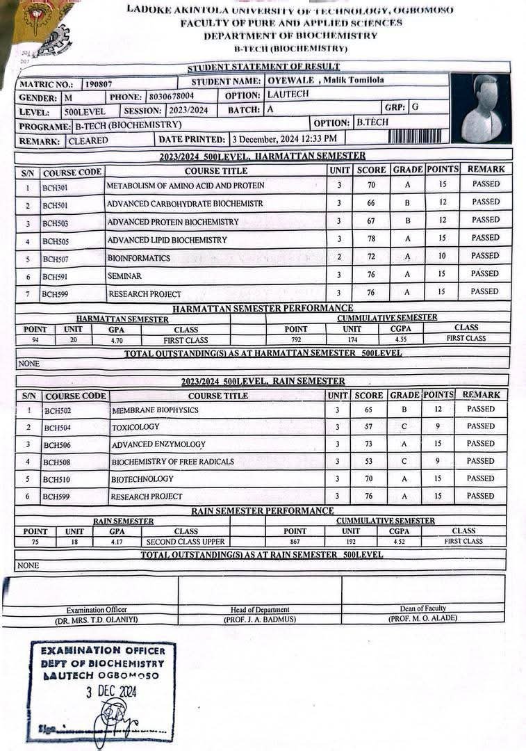 At just 21, Oyewale Malik Tomilola has etched his name into the academic hall of fame at Ladoke Akintola University of Technology (LAUTECH), Ogbomosho — graduating with a First Class in Biochemistry and a stellar CGPA of 4.52. But behind this glittering achievement lies a quiet storm of determination, faith, and a mother’s unshakable devotion.