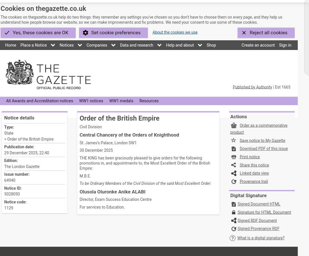 In the official Gazette for the Order of the British Empire published 29 December ,2025