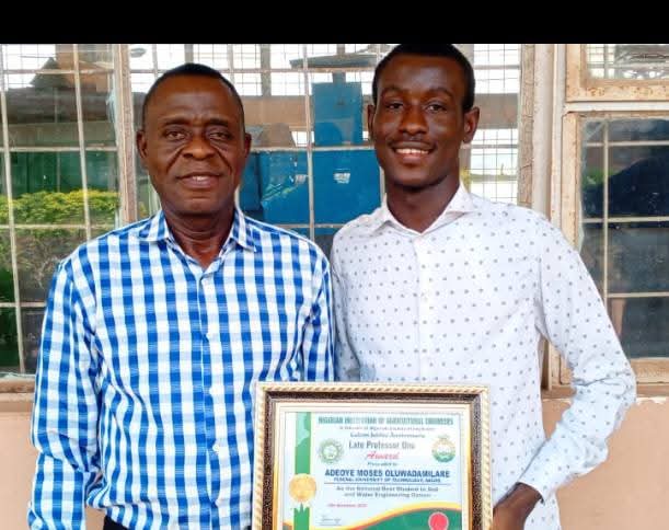 Adeoye Moses Oluwadamilare , a 2025 graduate of the Federal University of Technology Akure FUTA has won the Best Student in Soil and Water Engineering Award of the Nigerian Institution of Agricultural Engineers, NIAE.