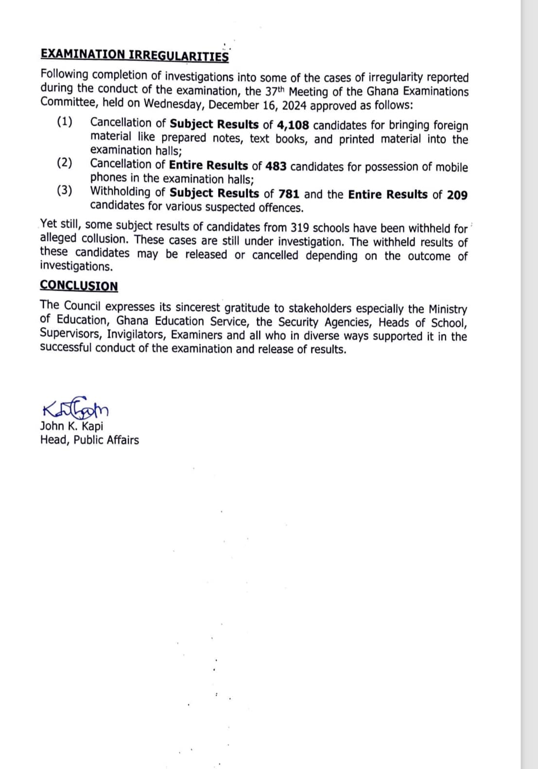 This is coming after a delay brought about by government indebtedness Cheating during the exam led to the cancellation of the subject results of 4,108 candidates Some results of 781 students and the entire results of 209 candidates have been withheld for various suspected offences