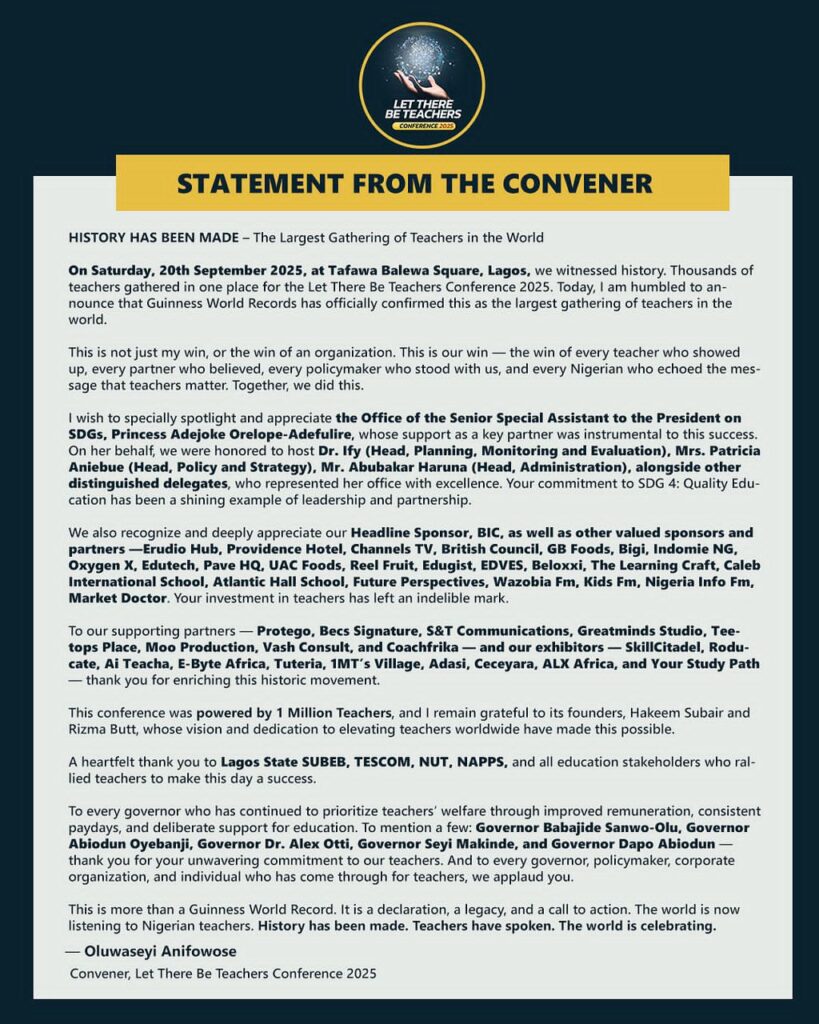 History was made on Saturday, September 20, 2025, at Tafawa Balewa Square, Lagos, as thousands of teachers converged for the Let There Be Teachers Conference 2025. The event has now been officially recognized by Guinness World Records as the largest gathering of teachers in the world.