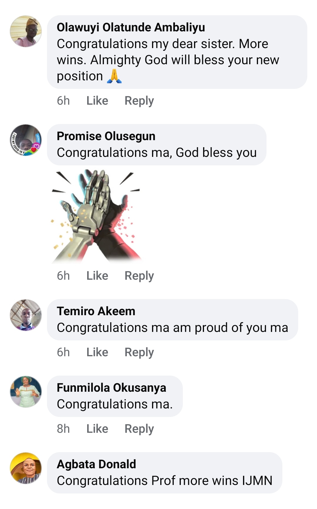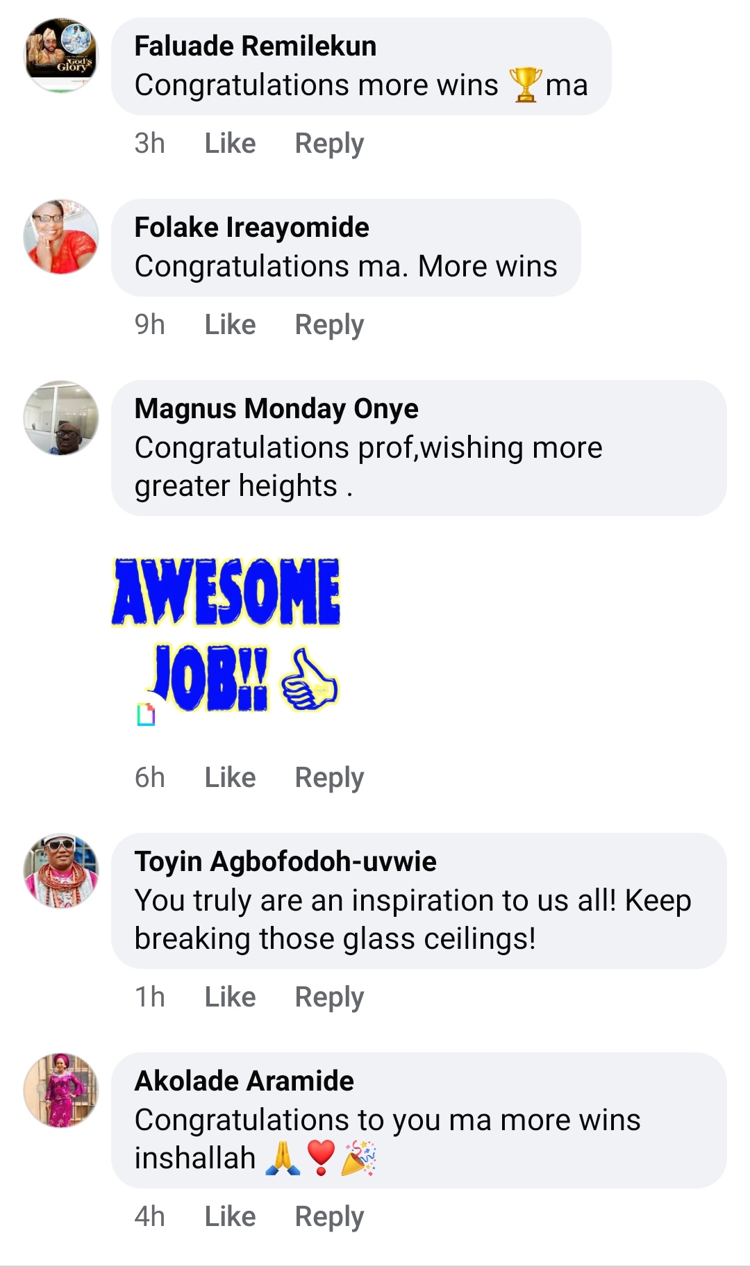 “Congratulations Prof. Maryam Omolara Quadri, Ilugrams ’83 set, on this great achievement. More feathers to your cap.”