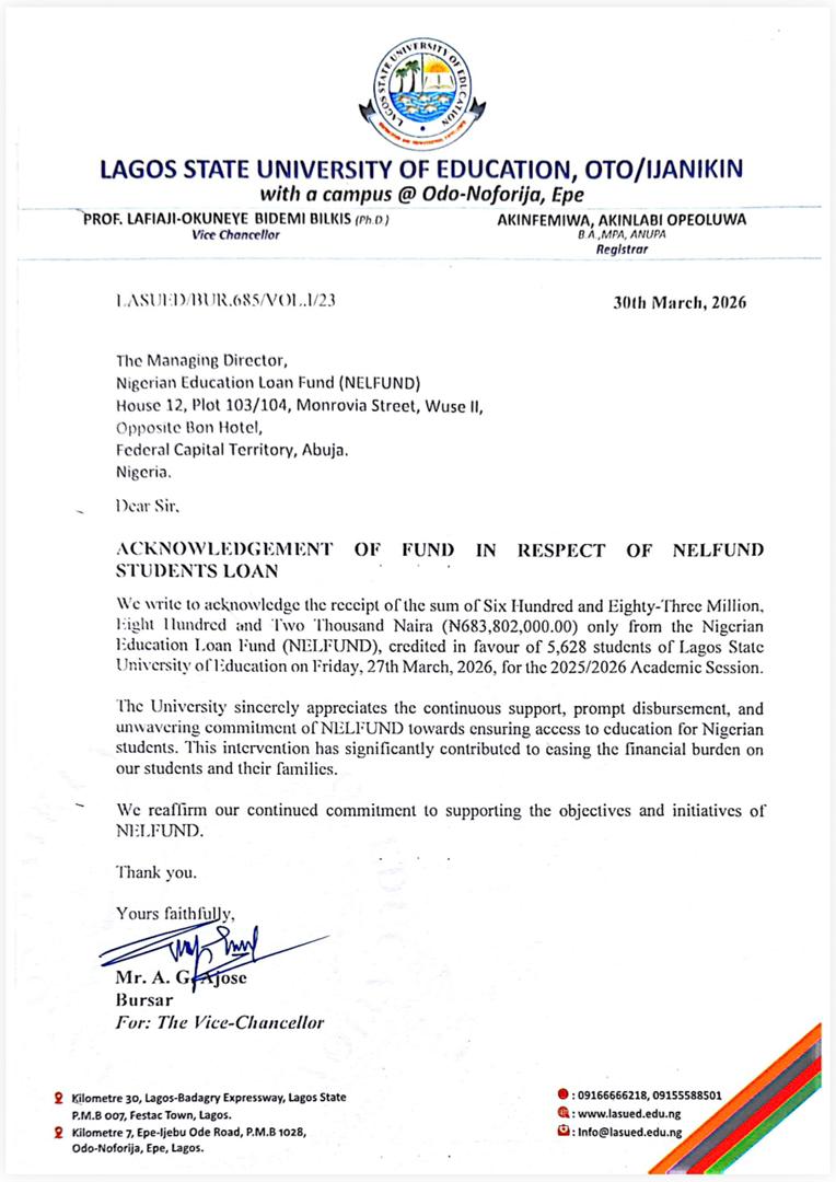 On behalf of *5629* successful applicants enrolled at the *Lagos State University of Education, Oto/Ijanikin, Lagos State*, the institution has been paid a substantial amount of fees by *NELFUND* , being credit for the 2025/2026 academic session: