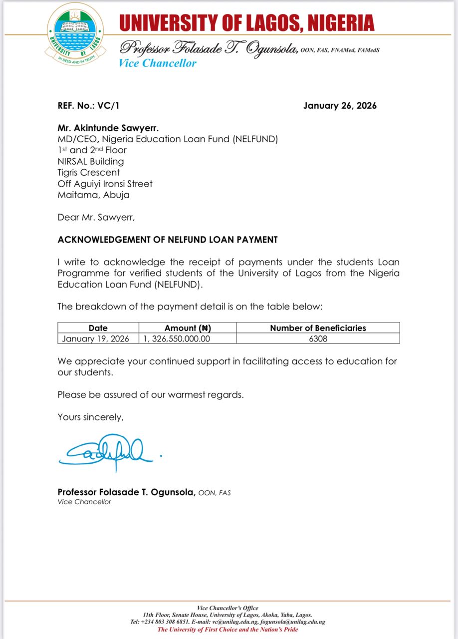 The disbursement was confirmed in an official acknowledgement letter dated January 26, 2026, issued by the Vice-Chancellor of the University of Lagos, Professor Folasade T. Ogunsola, to the Managing Director and Chief Executive Officer of NELFUND, Mr Akintunde Sawyerr.
