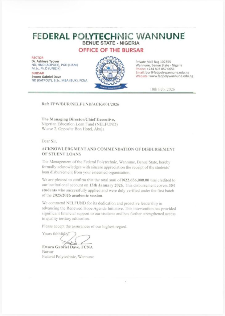 The Nigerian Education Loan Fund has disbursed a total of ₦22,656,000 to Federal Polytechnic Wannune for the 2025/2026 academic session.