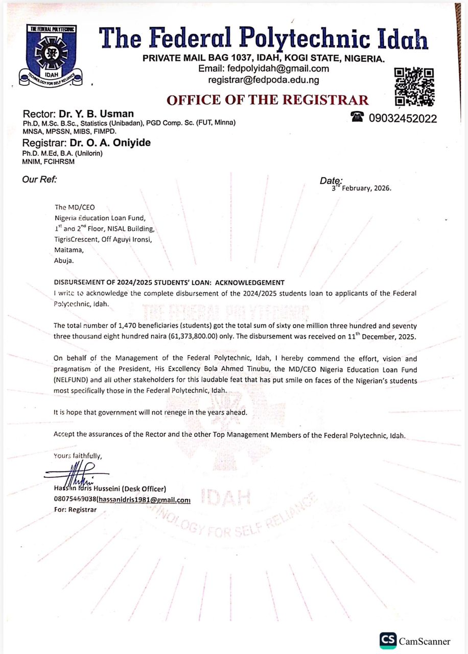 The Nigerian Education Loan Fund has disbursed a total of ₦61,373,800.00 to students of Federal Polytechnic Idah for the 2025/2026 academic session. The disbursement, made on February 3, 2026, is aimed at supporting students with tuition and other statutory charges.