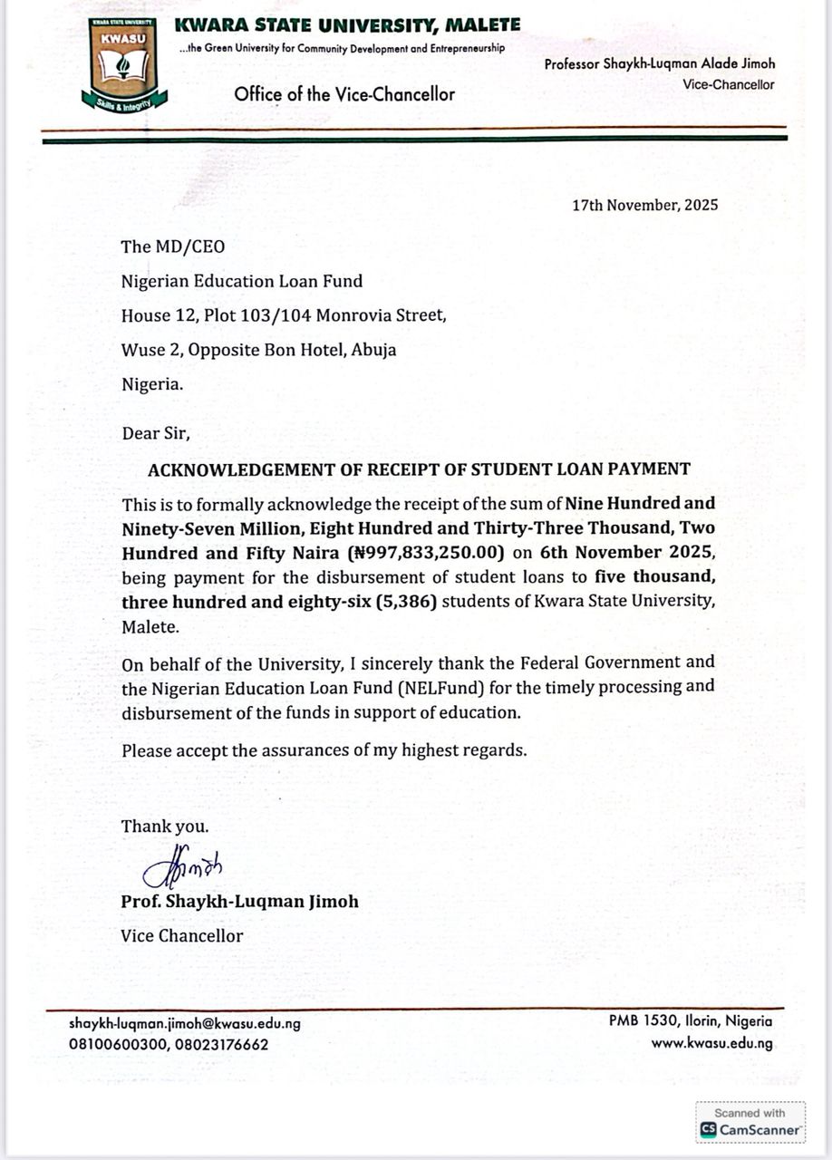 The Nigerian Education Loan Fund (NELFUND) has acknowledged the successful institutional loan disbursement to students of Kwara State University (KWASU), Malete, Kwara State, as part of its ongoing commitment to improving access to higher education across the country. The disbursement exercise, which took place on November 17th, 2025, reflects the Federal Government’s sustained efforts to ease the financial burden on students and their families through structured educational financing.