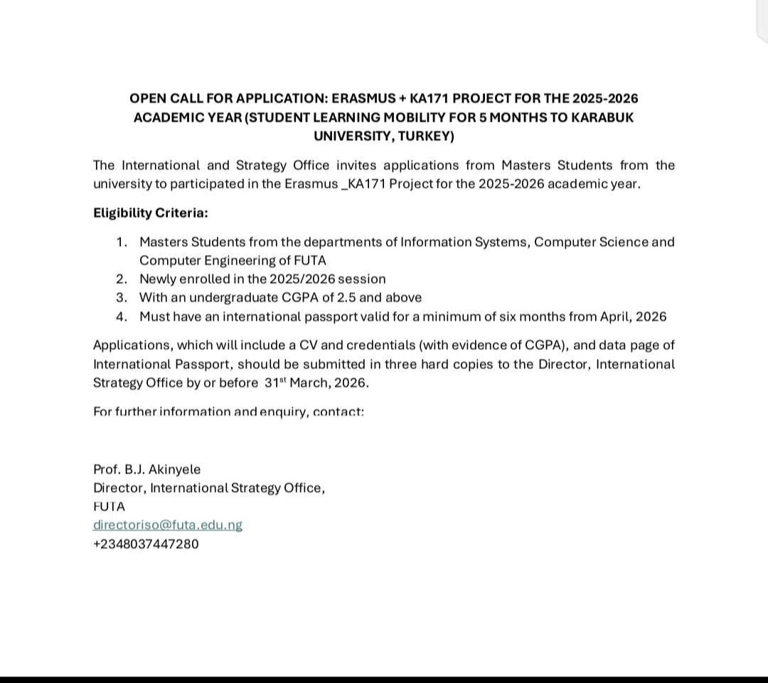 The International Strategy Office invites applications from qualified Master’s students of the Federal University of Technology, Akure (FUTA) for participation in the Erasmus+ KA171 Student Learning Mobility Programme for the 2025/2026 academic session.