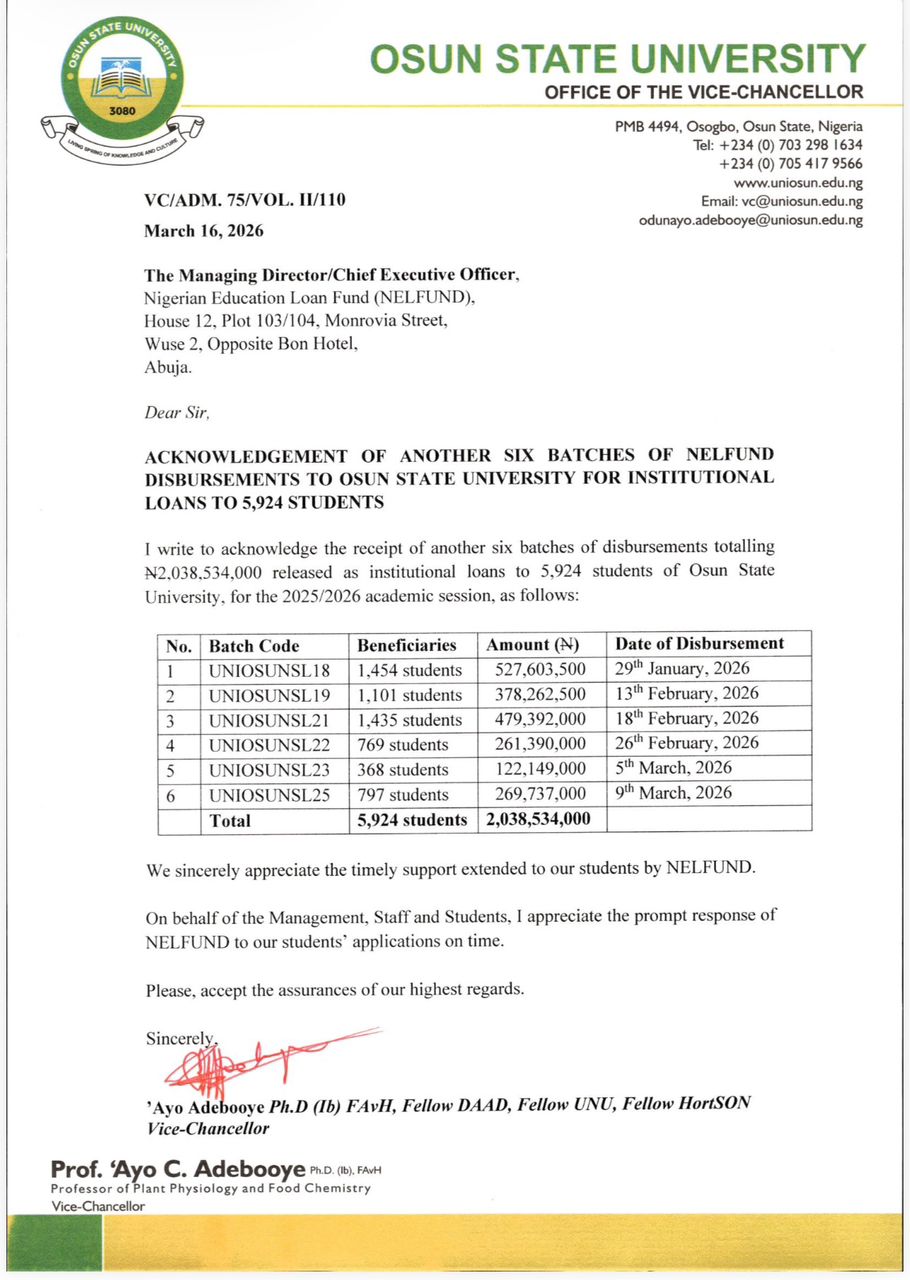 Osun State University, Osogbo has received a substantial NELFUND credit for the 2025/2026 academic session:
