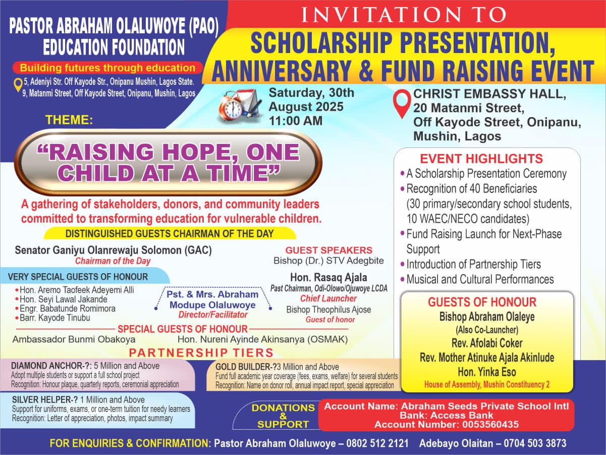 The Pastor Abraham Olaluwoye (PAO) Education Foundation, in partnership with Abraham Seeds College, will tomorrow, Saturday, launch a flagship scholarship scheme aimed at lifting underprivileged children out of educational deprivation.