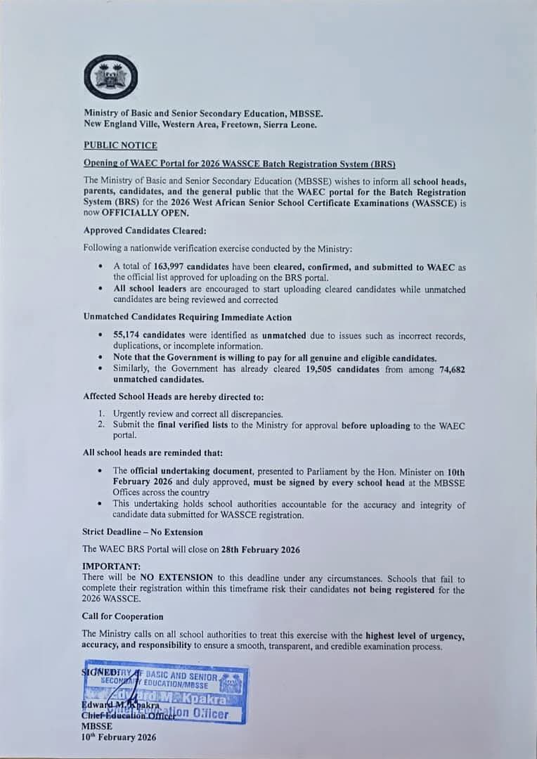 In a public notice issued in Freetown, the Ministry informed school heads, parents, candidates, and the general public that the portal is now fully operational for the upload of approved candidate lists.