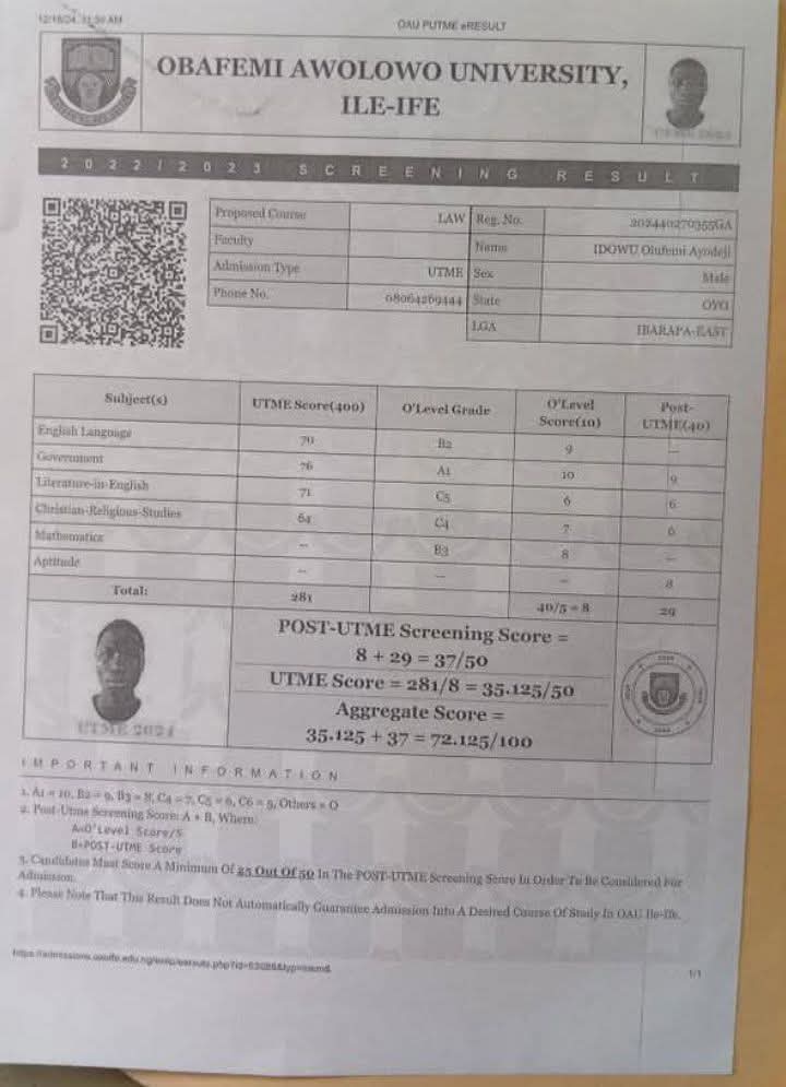 In 2024, when his aggregate score of 72.125 narrowly missed Obafemi Awolowo University’s Law cut-off mark of 73.95, Ayodeji described the moment as the breaking point.