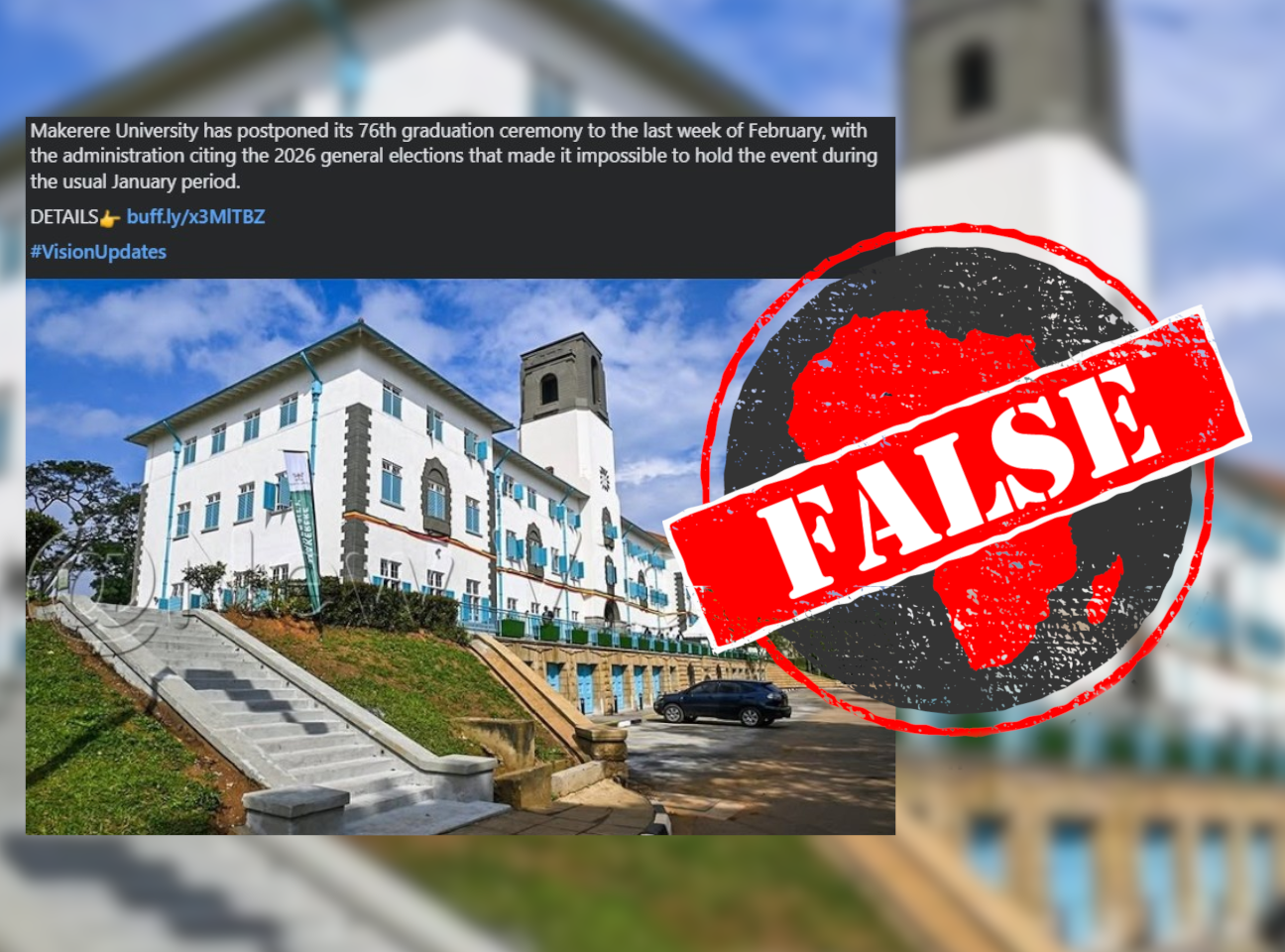 The false claim alleged that the university shifted the ceremony from its traditional January schedule to the last week of February, citing disruptions caused by the elections. Uganda held its general elections on 15 January 2026 amid reports of arrests, violence and an internet shutdown, leading to heightened political tensions in parts of the country.