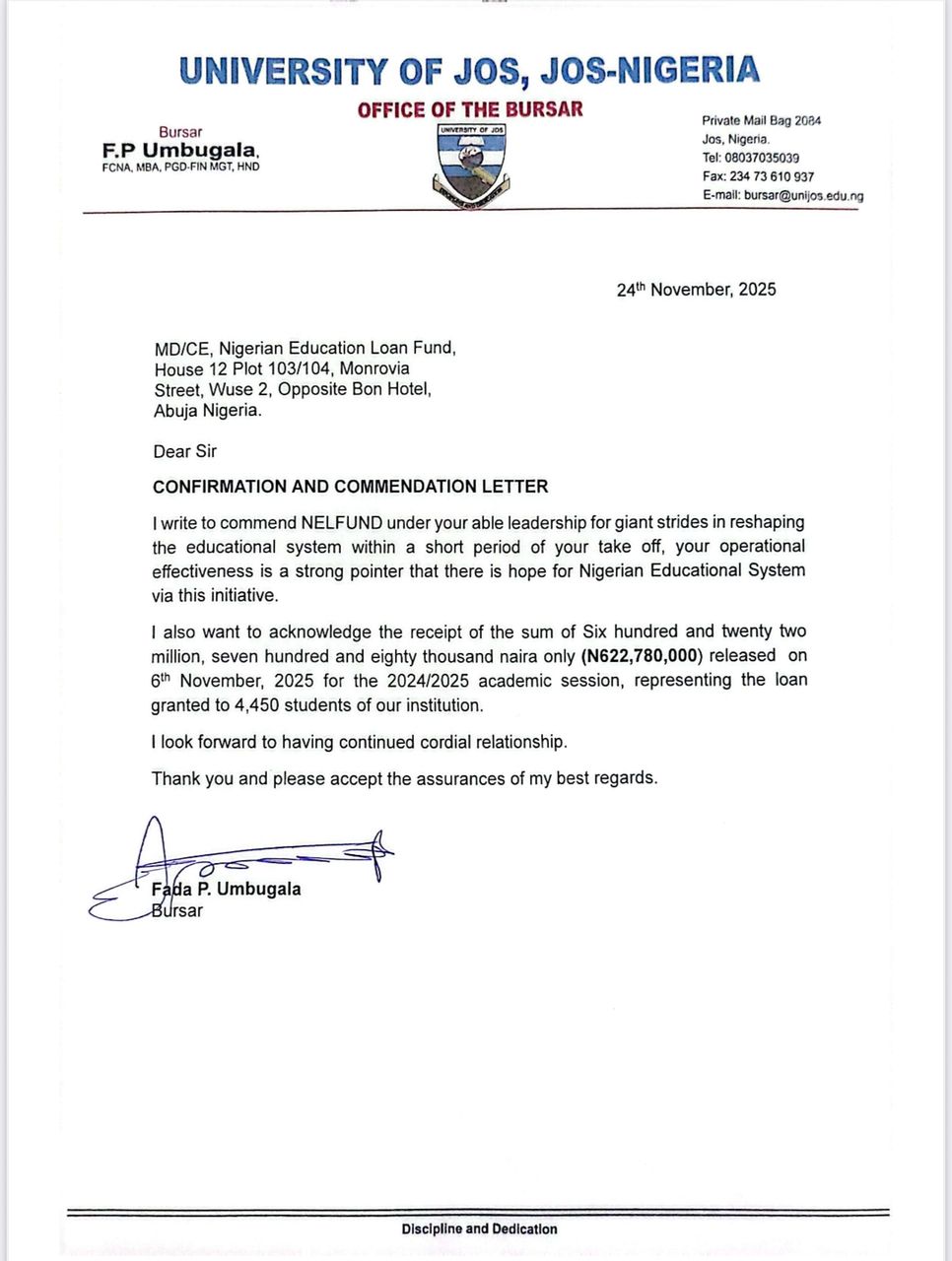The University of Jos has formally commended the Nigerian Education Loan Fund (NELFUND) for its impactful intervention in the country’s education sector, describing the initiative as a major boost to students’ access to higher education. The commendation was conveyed in an official letter issued by the Office of the Bursar of the University and dated November 24, 2025.